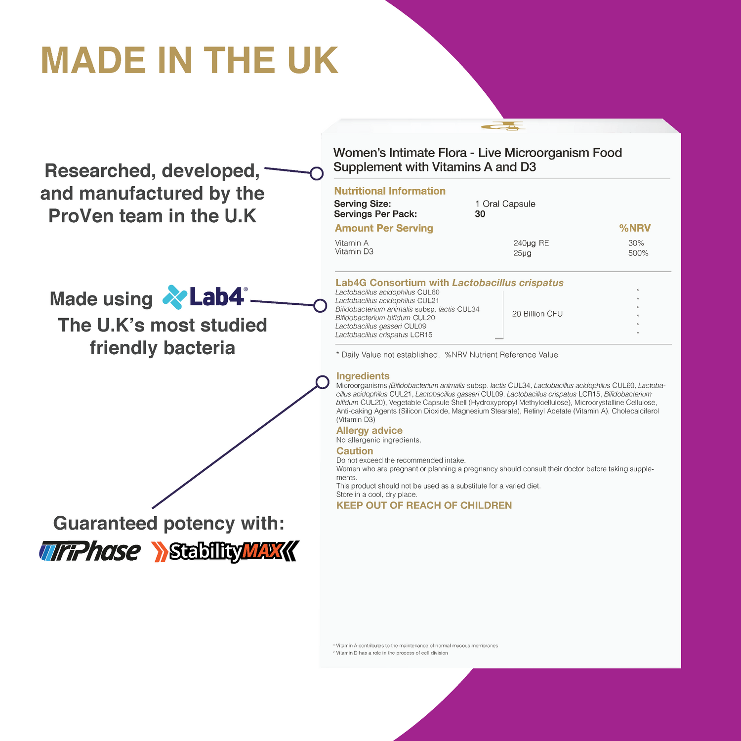 ProVen Probiotics Women’s Intimate Flora also contains vitamin A, which contributes to the maintenance of normal mucous membranes, and vitamin D, which contributes to cell division. Mucous membranes are located on the surface of the vaginal tract and cell division is part of the ongoing renewal process of the vaginal tissue.