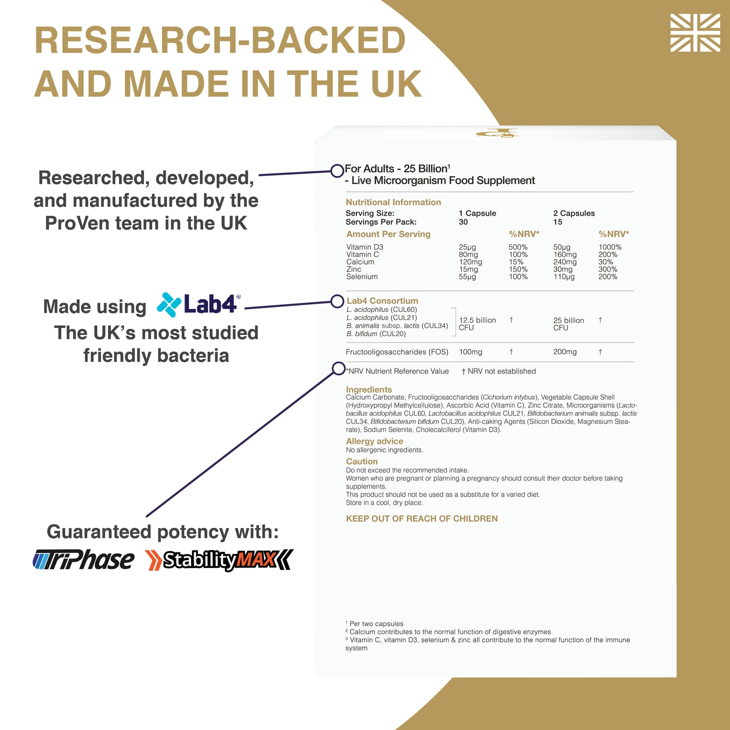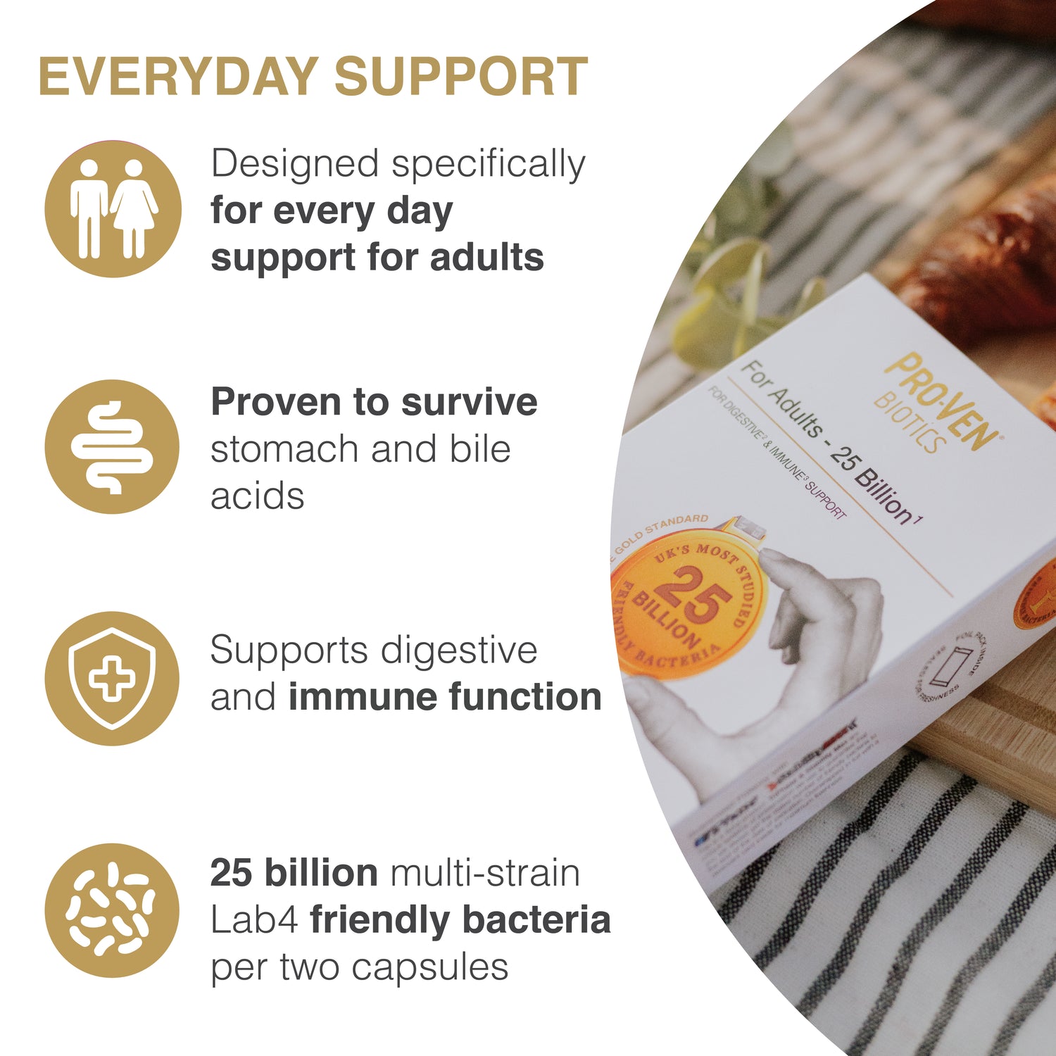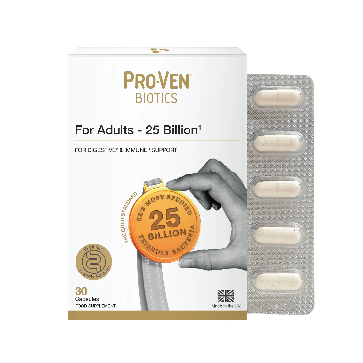 ProVen Biotics Adult Acidophilus & Bifidus – 25 Billion is a high-strength friendly bacteria supplement for everyday use for adults aged 16+. Supported by a unique body of UK and international clinical research, the Lab4 live bacteria in ProVen For Adults 25 Billion is the most comprehensively studied group of friendly bacteria in the UK.