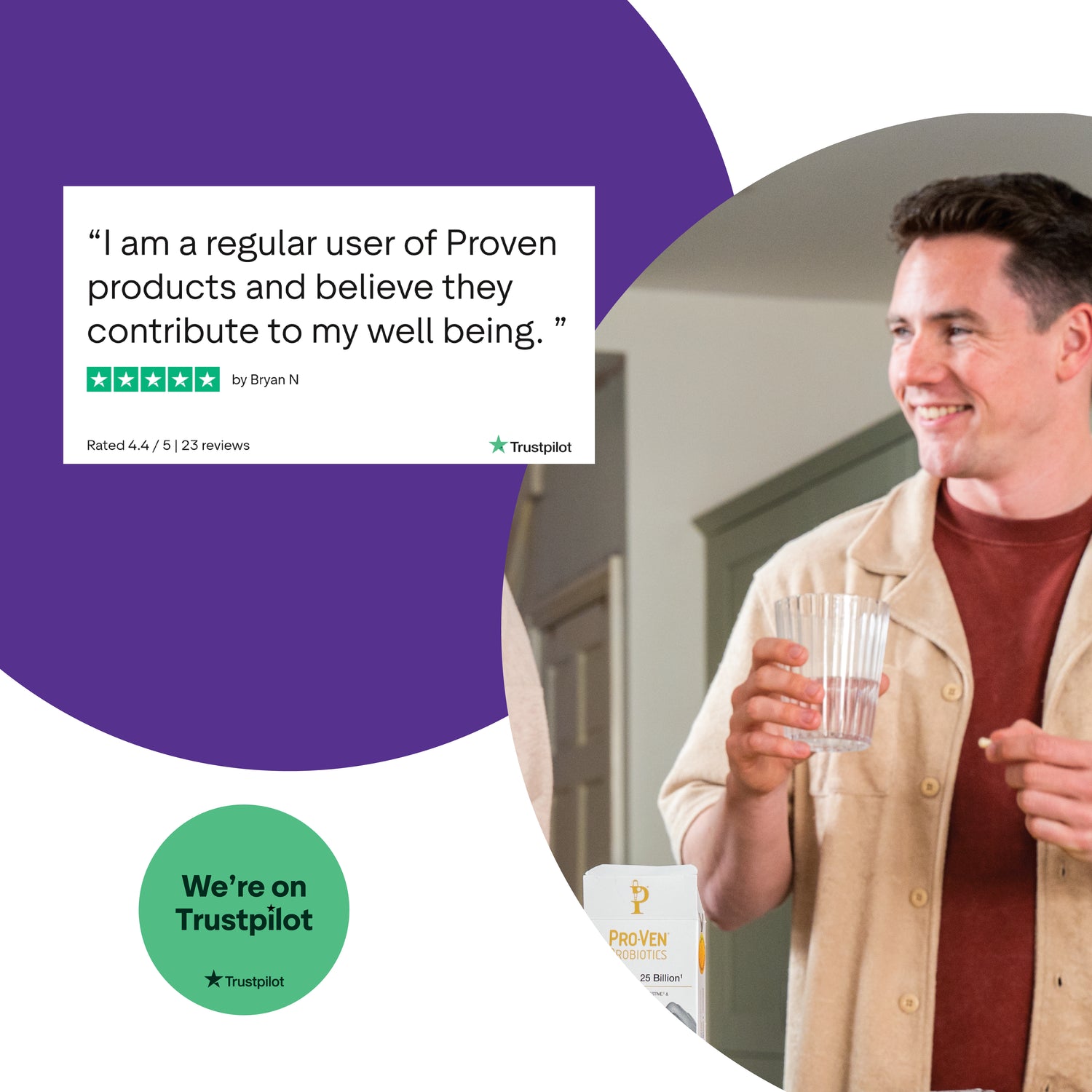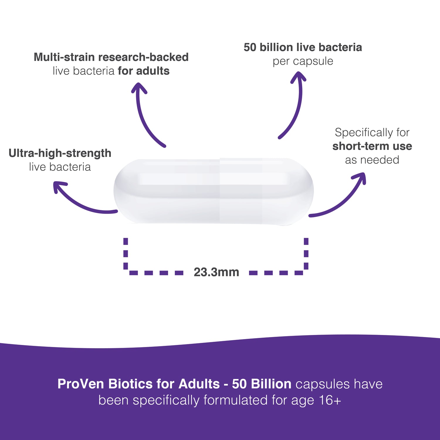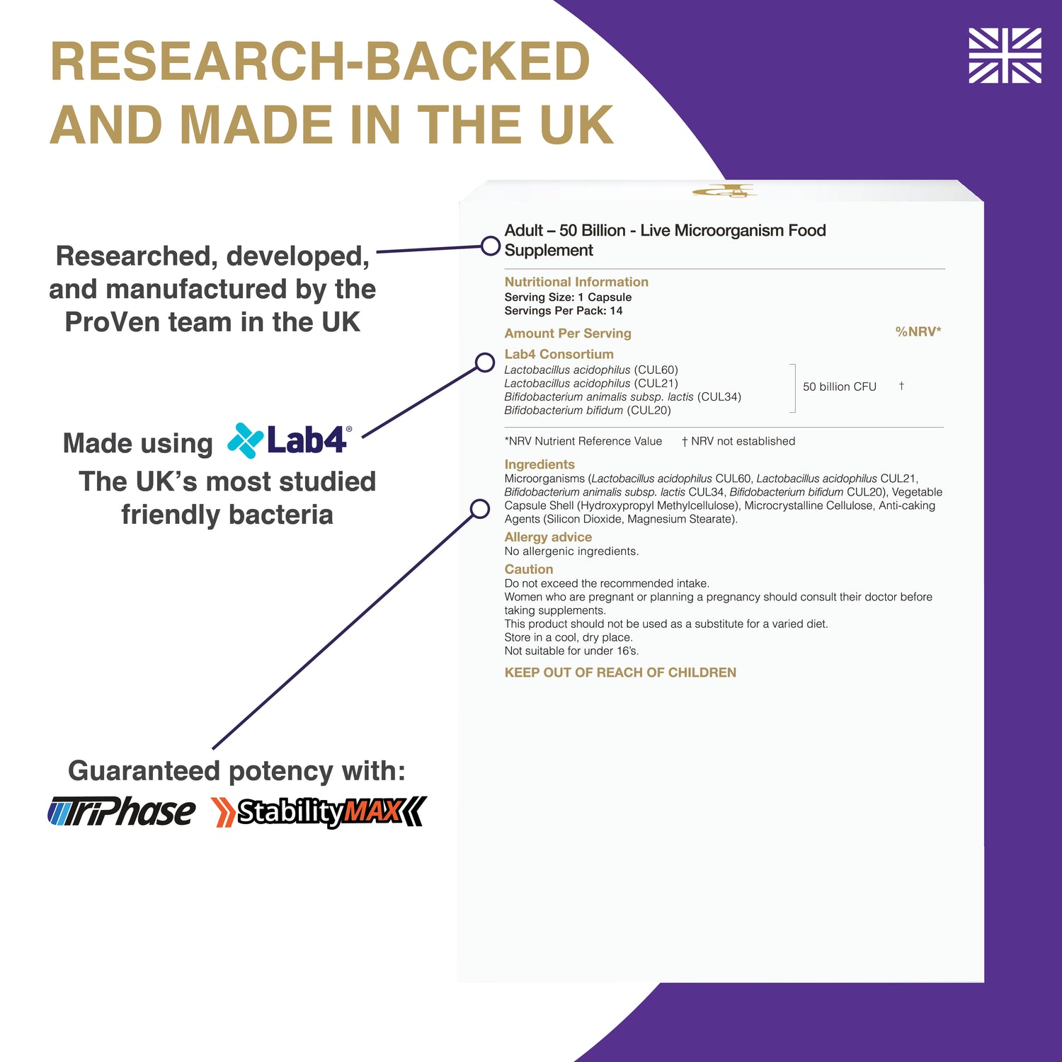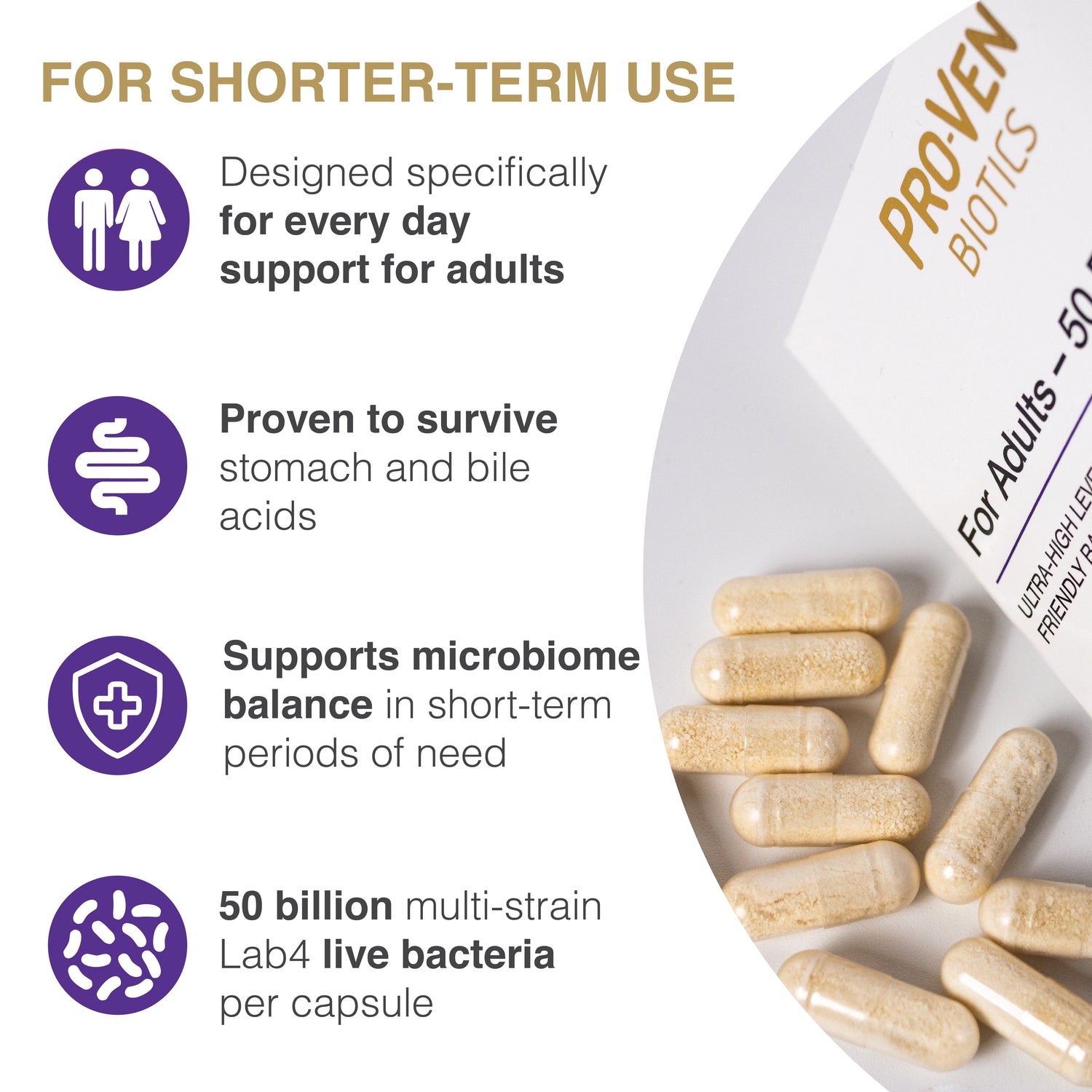With a robust 50 billion CFUs of our extensively-researched Lab4 live bacteria per capsule, ProVen For Adults - 50 Billion supports a balanced microbiome for those looking for a high strength friendly bacteria product for shorter-term use.